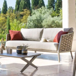 Le salon dispose d’une structure en acier traité époxy antirouille et d’un habillage en résine tressée résistant aux UV.