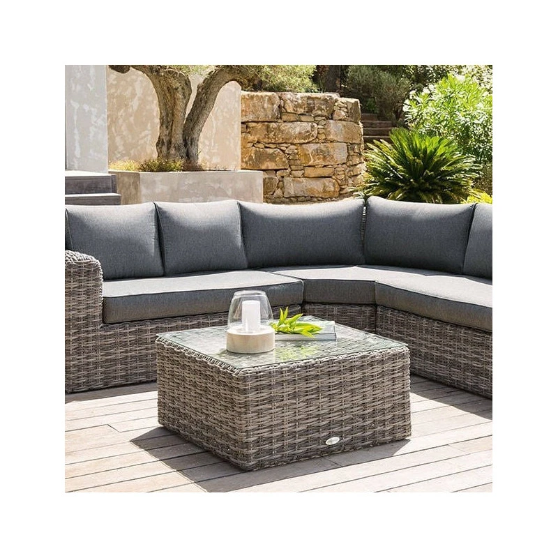 Conçue pour durer, la table dispose d’une structure en aluminium traité époxy antirouille, d’un habillage en résine tressée synthétique et d’un plateau en verre trempé.